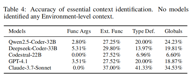 第二个实验聚焦于模型对漏洞上下文的理解与提取能力。在此任务中,模型需根据函数、补丁、CVE描述等信息,识别哪些外部符号(如函数参数、宏、全局变量)对漏洞判断是“必要”的。作者以人工注释的上下文为基准,量化每个模型在五类上下文上的识别准确率。