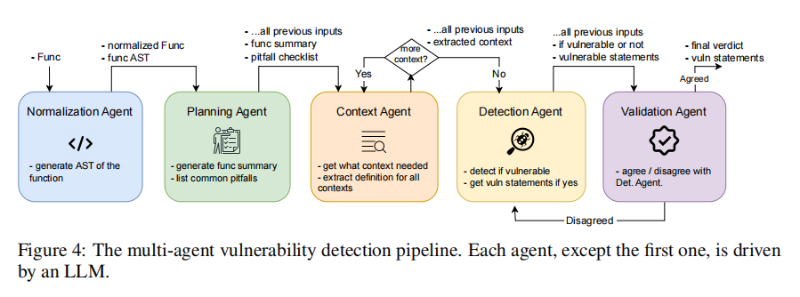 为了全面评估当前主流大语言模型(LLMs)在C/C++漏洞检测任务中的表现,作者基于SECVULEVAL数据集设计了两项核心实验任务:语句级漏洞检测与上下文信息识别。实验的核心技术支撑是一套精心构建的多智能体检测架构,由五个不同功能的智能体(Agent)协作完成,分别负责函数标准化、风险规划、上下文识别、漏洞检测和结果验证。这种模块化设计基于已有研究表明,将复杂任务拆解为子任务交由多个LLM分工处理,能显著提升准确率与稳定性。