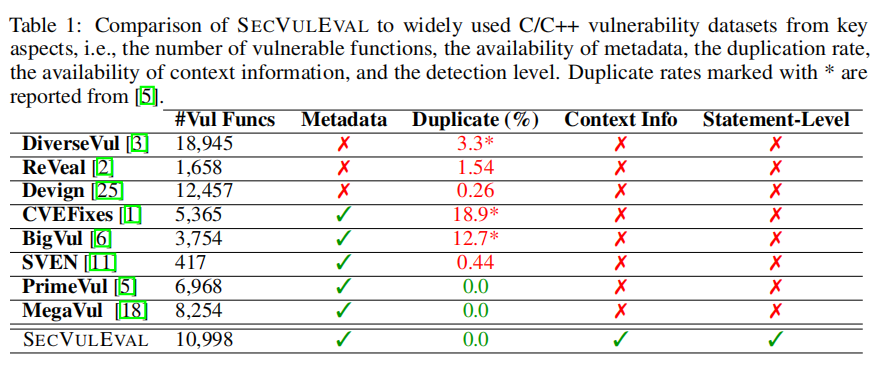此外,许多数据集存在高重复率(如CVEFixes高达18.9%),这不仅影响模型泛化能力,还可能导致训练集与测试集间的数据泄露。SVEN虽具备人工标注的高准确率,但样本数量极少,仅收录417个函数。总体来看,这些数据集普遍停留在函数或行级别,缺乏语句级漏洞定位与必要上下文信息,限制了其在真实场景中的适用性。本文提出的SECVULEVAL正是为弥补这些不足而构建,提供更细粒度、更高质量的漏洞检测基准。
