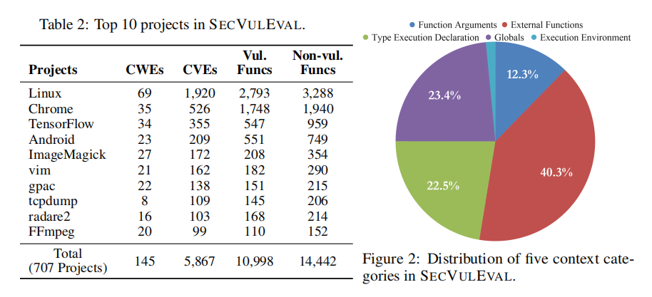 为了提升数据质量,作者引入多轮去噪策略,排除文档文件、无函数变更的提交、代码格式化操作及与漏洞无关的冗余更改。然后,通过对每个函数进行MD5哈希去重,彻底消除数据泄露风险。最后,为弥补传统数据集中缺乏上下文的问题,SECVULEVAL使用GPT-4.1自动提取五类关键上下文信息(如全局变量、类型定义、函数参数等),显著增强了模型对真实漏洞场景的理解能力。这一系统化构建流程,确保了数据集在准确性、代表性与实用性上的显著提升。
