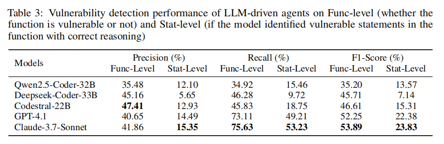 在第一个实验中,研究团队评估五个主流LLM(Claude-3.7-Sonnet、GPT-4.1、Qwen2.5-Coder、DeepSeek-Coder和Codestral)在语句级漏洞检测上的能力。每个模型在多智能体框架中运行,最终由验证智能体评估其是否能正确识别出漏洞所在语句,并给出合理解释。为确保评估客观性,作者从数据集中抽取300个样本进行人工验证。