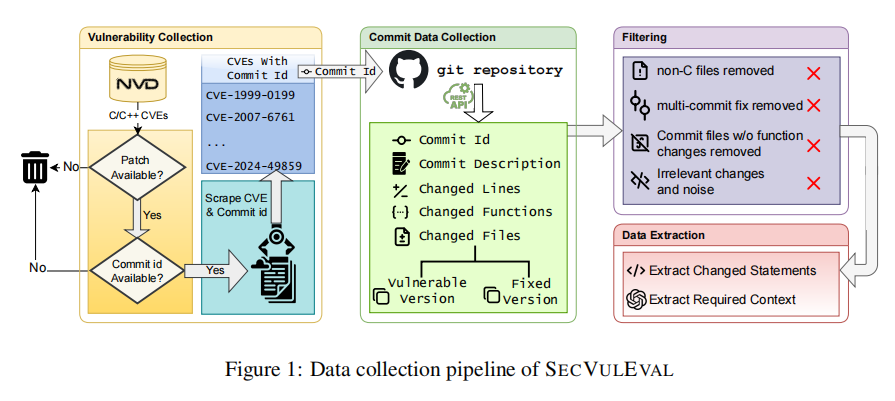 SECVULEVAL的构建过程分为四个主要阶段,旨在创建一个高质量、细粒度、具备上下文感知能力的C/C++漏洞检测数据集。首先,研究团队从国家漏洞数据库(NVD)中筛选出覆盖C/C++项目的有效CVE条目,仅保留具有修复补丁和Git提交记录的样本,并进一步剔除来源不明或重复的提交。其次,通过GitHubAPI获取每个补丁对应的代码变更内容,包括函数级和语句级的新增与删除记录,以及补丁前后的完整函数代码。