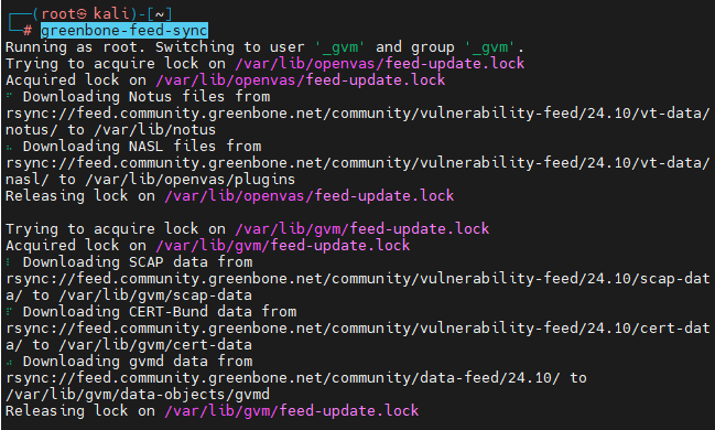 同步过程由两部分组成:1、通过rsync下载更改,2、通过守护进程将更改加载到内存和数据库中。我们可以使用greenbone-feed-sync命令来触发同步。