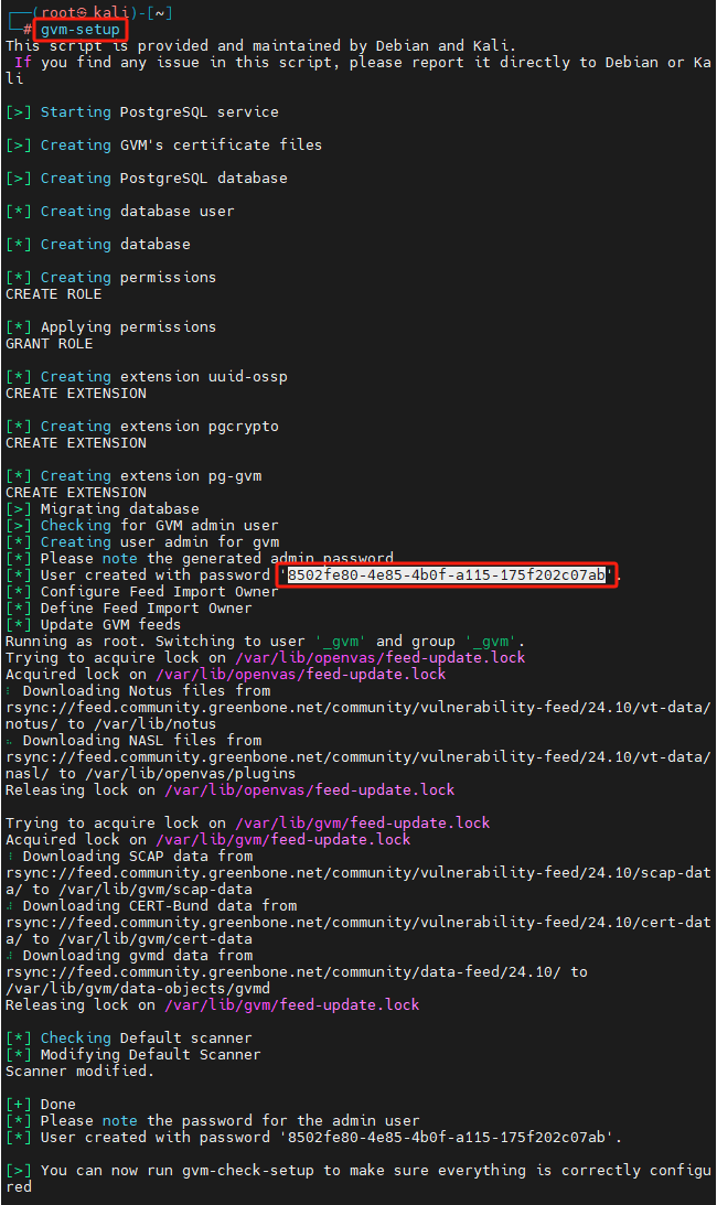 gvm-setup的设置过程很快,在回显信息中,我们需要记录为管理员用户admin创建的默认密码,如图中框选的部分。