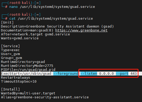 默认情况下,Greenbone社区版仅允许本地主机通过IP地址127.0.0.1访问GSA WEB页面。如果我们想启用WEB页面的远程访问,可以通过修改gsad的systemd服务文件/usr/lib/systemd/system/gsad.service来实现,例如将–listen参数的值更改为0.0.0.0以监听所有网卡,并可选择将–port参数的值更改成标准的HTTPS端口443: