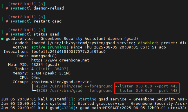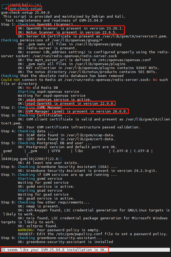 可以看到,经过一共9项检测,最终提示GVM-25.04.0安装成功。同时,我们还能看到各组件的版本信息,例如OpenVAS扫描器的版本是23.20.1,Notus扫描器的版本是22.6.5,ospd-OpenVAS的版本是22.9.0,gvmd(GVM Manager)的版本是26.0.0,组件版本比Docker版本要新一些。不过,NVT数量只有93947个,只有Docker版本的58 %。