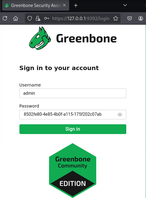 不过Kali中的GVM默认使用的是HTTPS,能提供更好的数据安全性。我们通过浏览器访问GSA页面https://127.0.0.1:9392,提供前面自动生成的管理员密码进行登录。