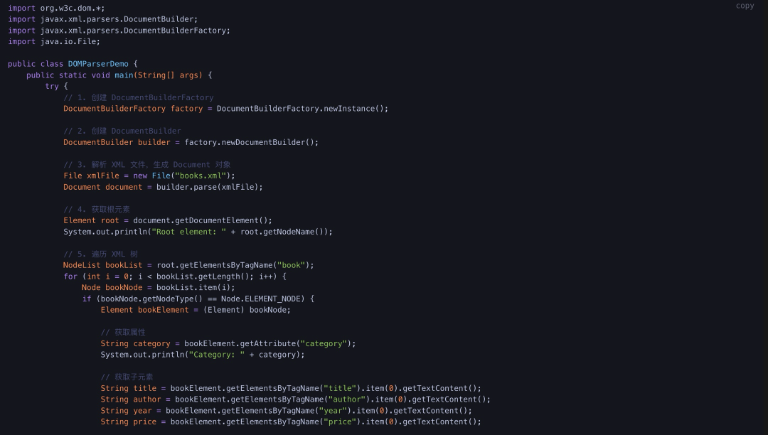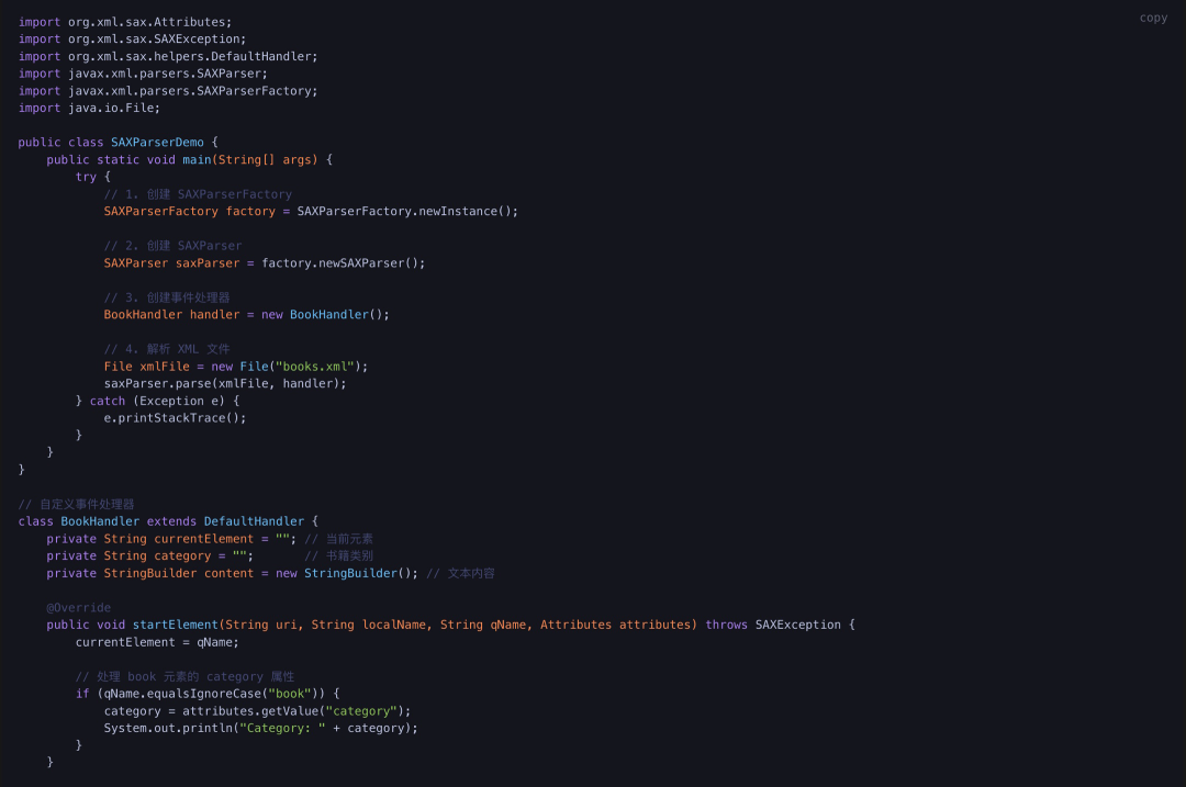 DOM和SAX为原生自带的,JDOM、DOM4J和Digester需要引入第三方依赖库,常见的XML解析有以下几种方式