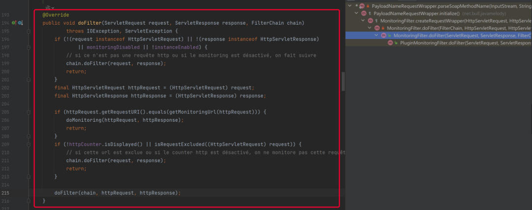 继续查看调用关系还是在MonitoringFilter.java的doFilter方法,发现重写了doFilter