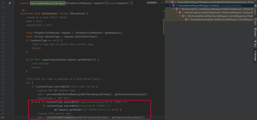 104行PayloadNameRequestWrapper类的initialize方法主要是做了判断,需要HTTP请求头contentType = “application/soap+xml”或者”text/xml”并且”SOAPAction”不为空