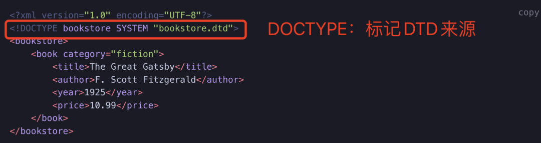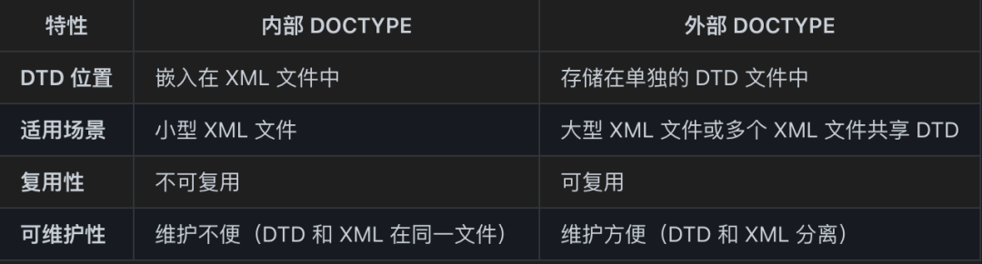 是 XML 文件中用于声明 DTD 的语法。它告诉解析器使用哪个 DTD 来验证 XML 文档的合法性。DOCTYPE可以引用内部 DTD 或外部 DTD,其中只有外部DTD才会引发XXE外部实体注入漏洞。