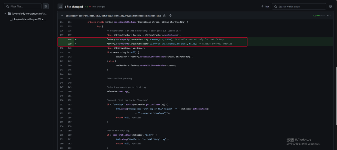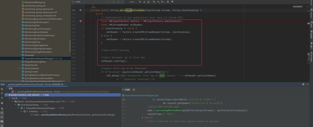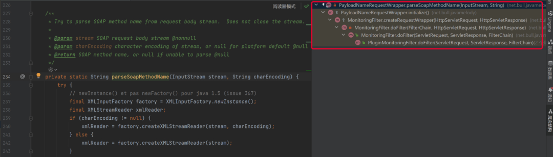 234行PayloadNameRequestWrapper类中parseSoapMethodName方法使用XMLInputFactory进行解析Xml文件,直接解析。