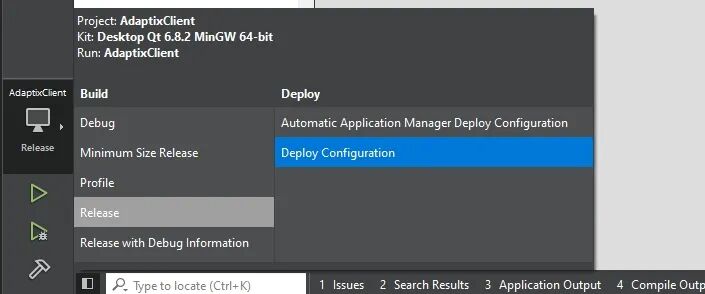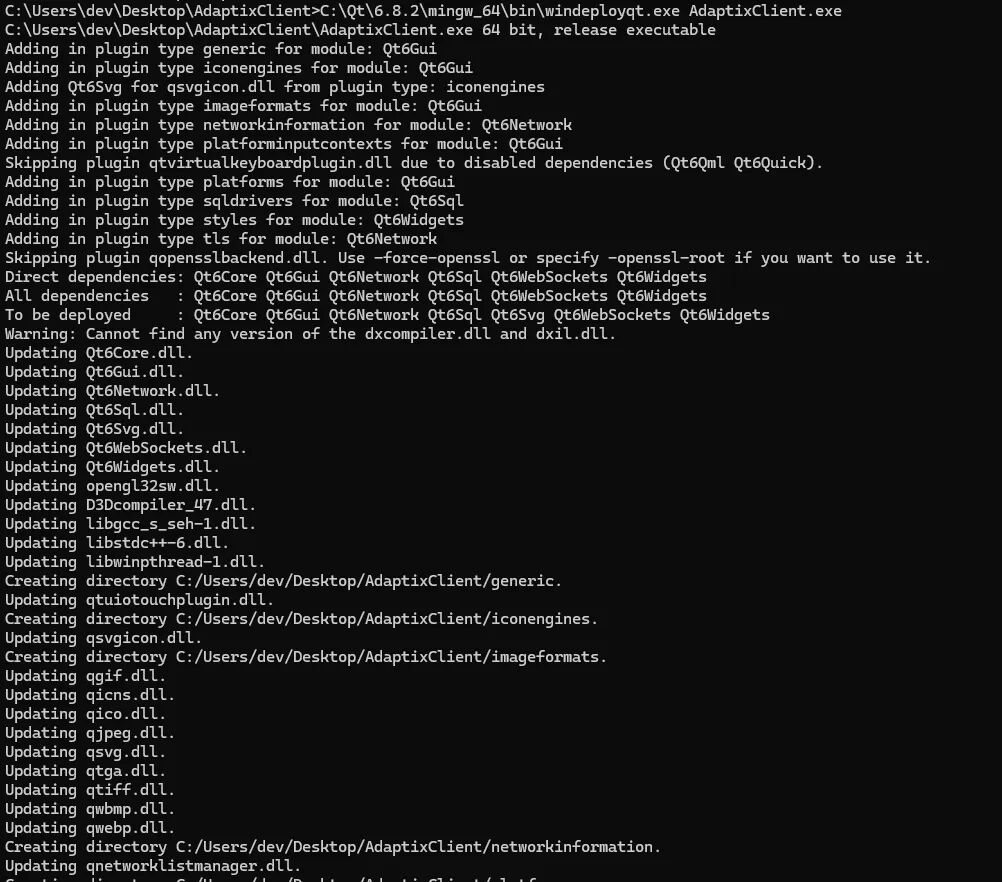 为客户端创建一个目录,所有依赖项都将被复制到该目录。将 AdapticClient.exe 可执行文件移动到此目录,打开 cmd.exe 并运行windeployqt.exe。