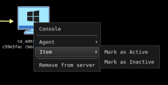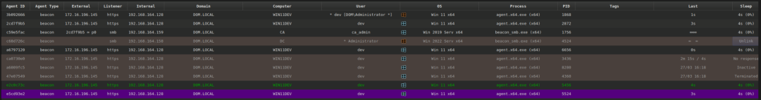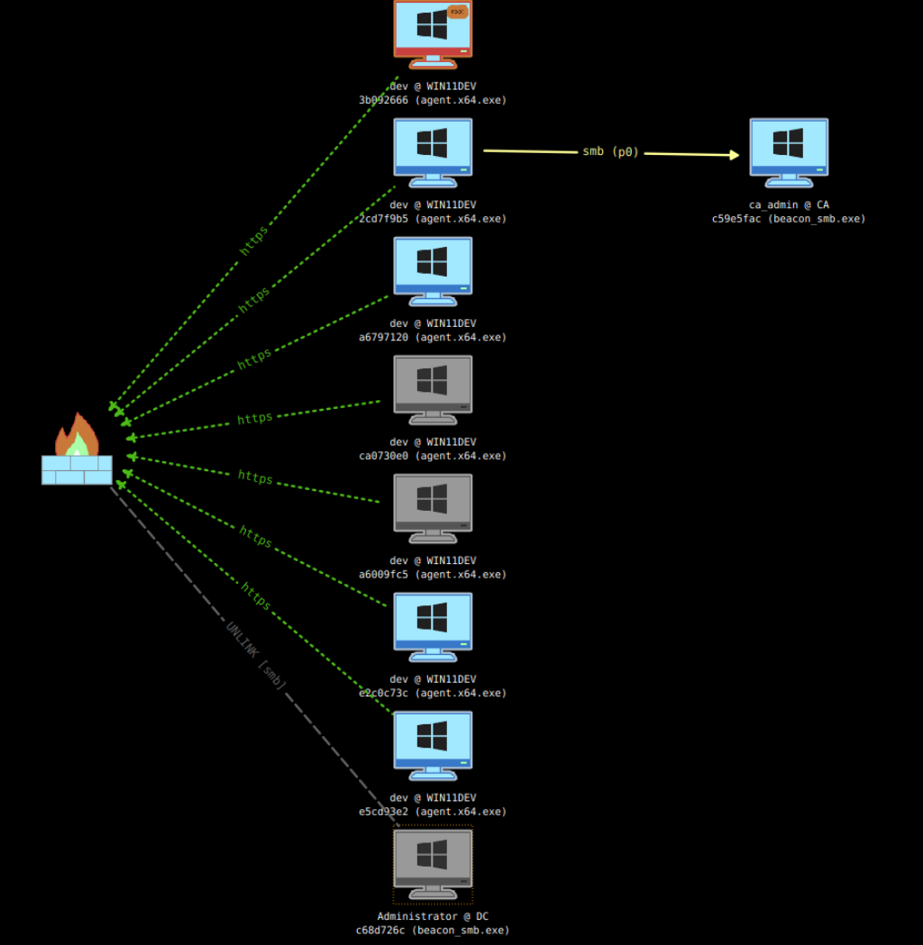 会话图以自然的方式显示代理链。每个代理会话都有一个计算机图标,指示其操作系统和权限级别。如果图标为红色,则表示代理正在特权进程中运行。灰色图标表示代理当前已检查(可能处于非活动状态)。