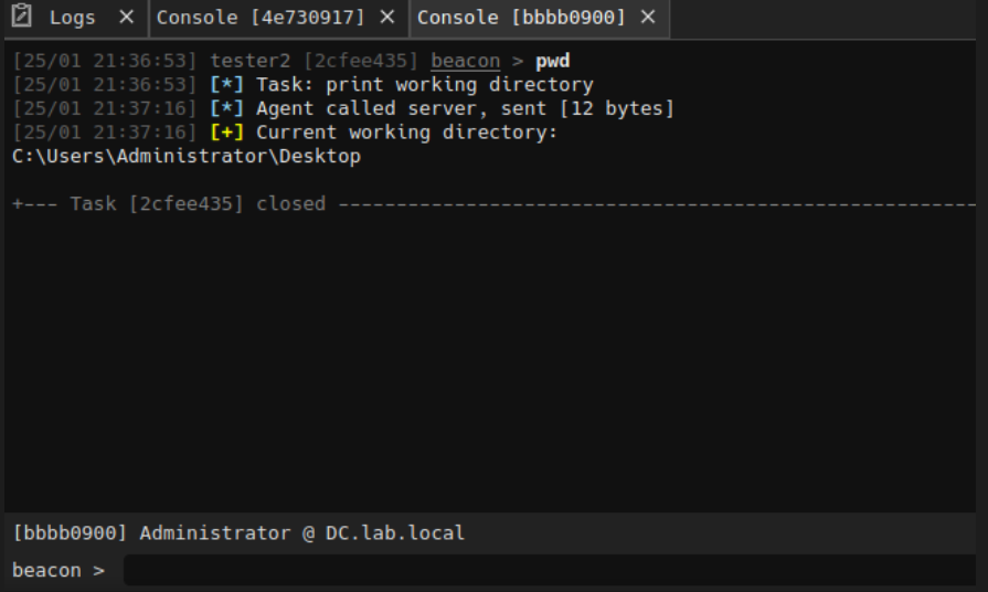 代理控制台如下所示。每个命令包含操作员名称、任务 ID 和代理类型。控制台会保存输入命令的历史记录,并自动完成命令。