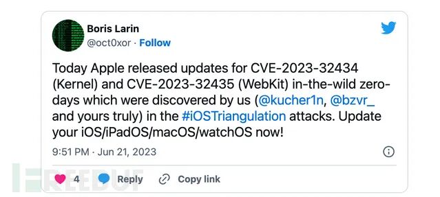 前几天,苹果公司在修补用于部署 Triangulation 间谍软件的 0day 漏洞一天后,发送了另一轮威胁通知,提醒客户他们成为有国家背景支持的攻击目标。然而,据 CNN 记者 Chris Bing 报道,目前尚不清楚这些新警告与哪些事件有关。