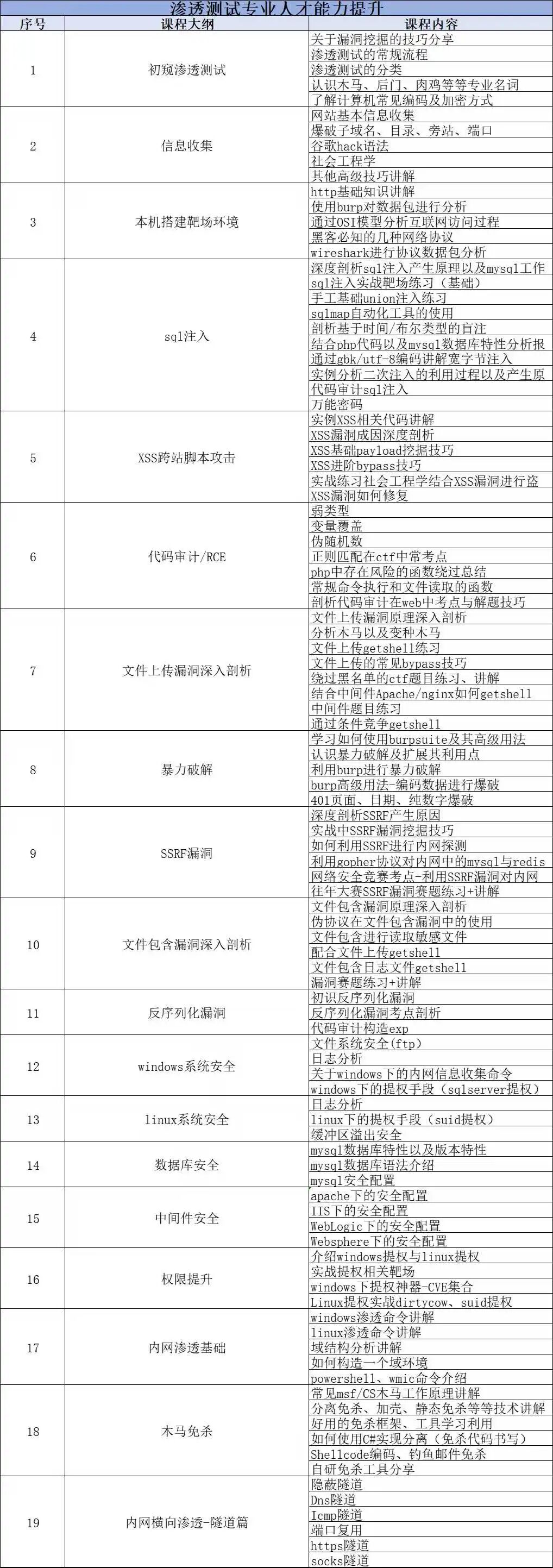搭建靶场、Windows/Linux系统安全、sql注入、XSS、代码审计/RCE、木马免杀、暴力破解、SSRF、提权