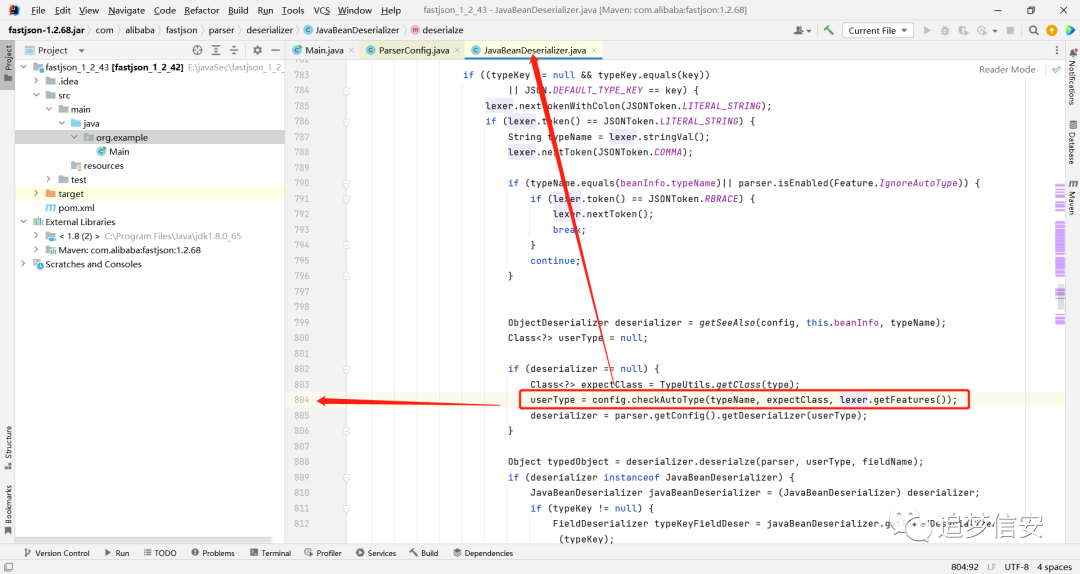 于是我们全局搜索,可以看到有如下五处调用:【两万字原创长文】完全零基础入门Fastjson系列漏洞(基础篇) -76