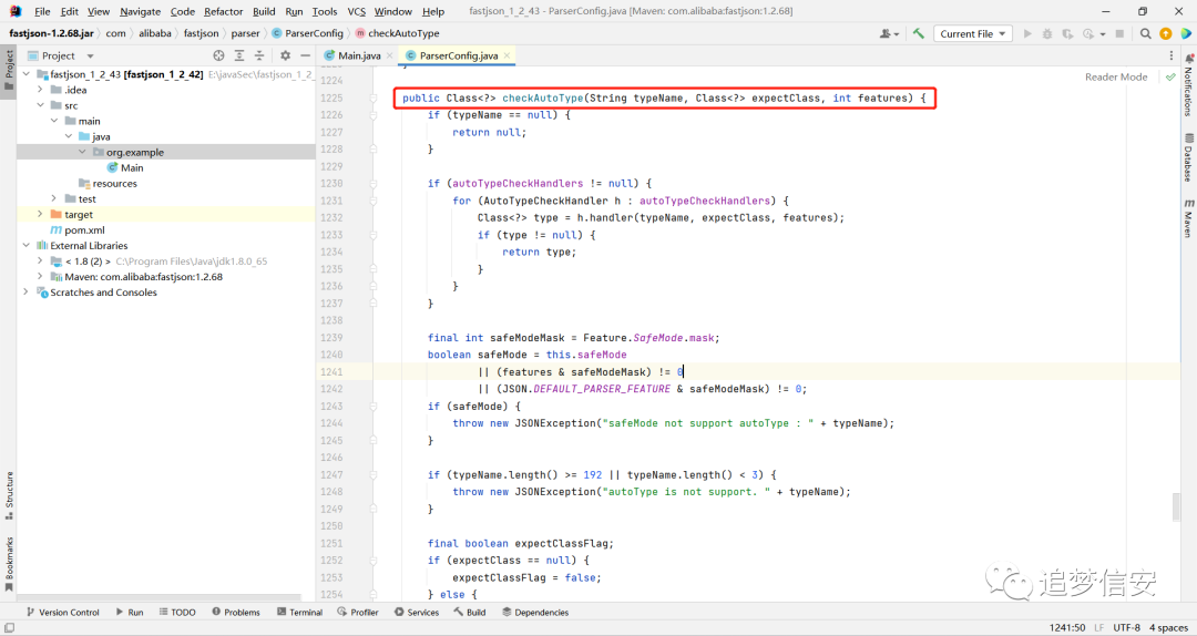 修改之前的pom.xml里面的版本为1.2.43。直接全局搜索checkAutoType,看修改后的代码:【两万字原创长文】完全零基础入门Fastjson系列漏洞(基础篇) -99