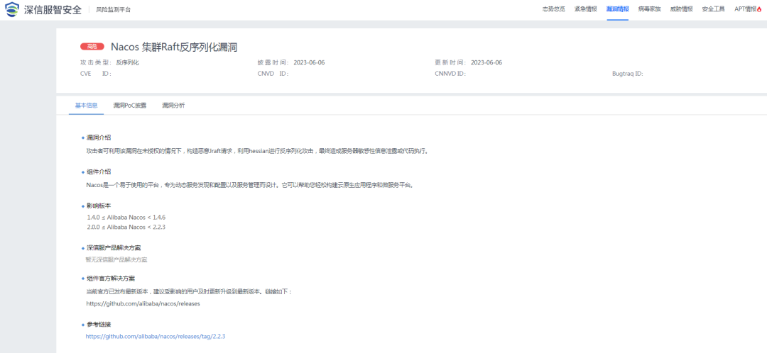 2023年6月6日,深信服安全团队监测到一则Alibaba Nacos组件存在反序列化漏洞的信息,漏洞威胁等级:高危。