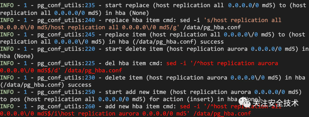 红色高亮的部分是显示执行命令的日志。虽然这些命令是在第二个容器中执行的,但它们修改了与我们的数据库容器共享的配置文件。sedsed/data/pg_hba.conf