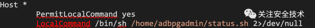为了在第二个容器中执行代码,我们想到了一个有趣的想法。由于每次我们重新启用 SSL 操作并共享主目录时都会执行 SSH 命令,因此我们可以修改本地 SSH 客户端配置文件/home/adbpgadmin/.ssh/config. 通过这样做,我们可以将LocalCommand字段配置为在下一次 SSH 命令执行期间执行我们自己的任意命令。