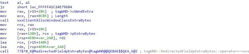 在CVE-2021-1732中,攻击者正是hook xxxClientAllocWindowClassExtraBytes的用户层回调函数,强行改变窗口对象tagWND的扩展数据的保存位置以及寻址方式,从而触发一个任意地址覆盖写漏洞。