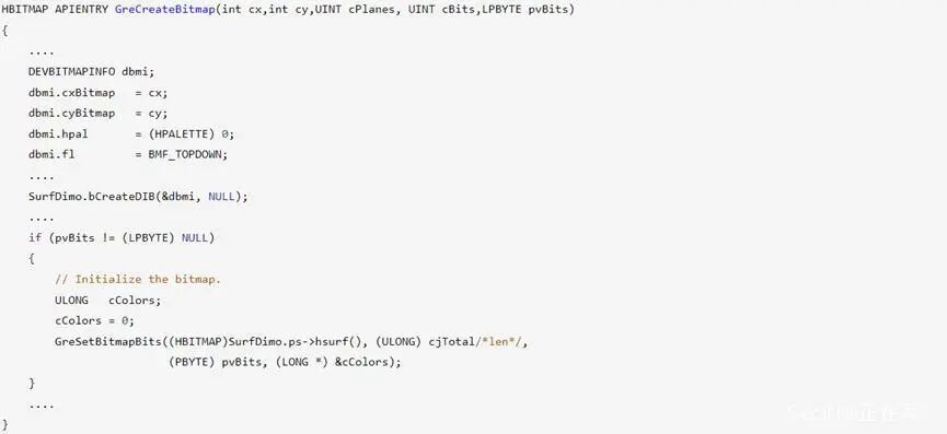 在GreCreateBitmap函数中,首先根据传入的 cPlanes 和 cBitsPerPel参数确定位图的像素位类型,然后创建一个DEVBITMAPINFO对象,通过CreateBitmap前四个参数去内存块中申请一片内存并且设置位图数据扫描线的长度。接着lpBits如果不为0,则通过GreSetBitmapBits去设置像素数据。