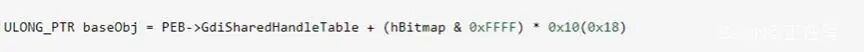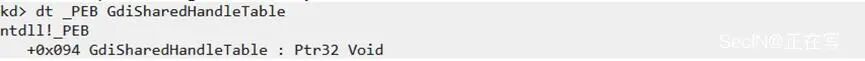 在R3通过CreateBitmap创建位图成功后会得到一个hBitmap,如果要在R3去泄露该对象在内核中的地址可以通过GdiSharedHandleTable获取。GdiSharedHandleTable位于PEB+0x94的位置。