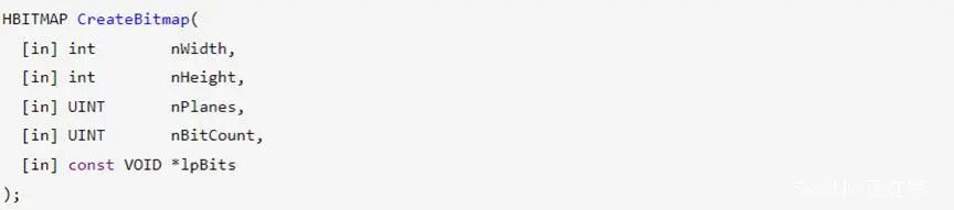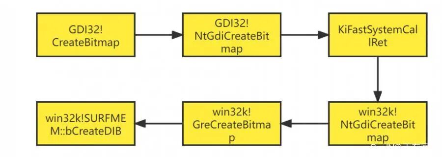 创建具有指定宽度,高度和颜色格式(颜色平面和位每像素)的位图,而前文中也提过bitmap在内核中关联的对象SURACE,由SURACE通过CreateBitamp的前4个参数去精确控制分配的内核内存块的大小。其调用链如下: