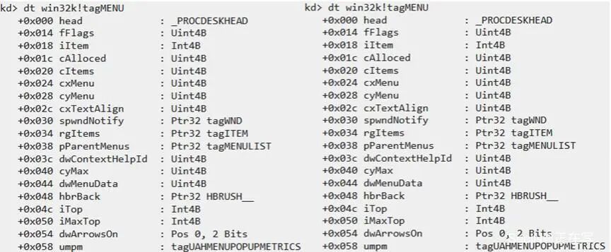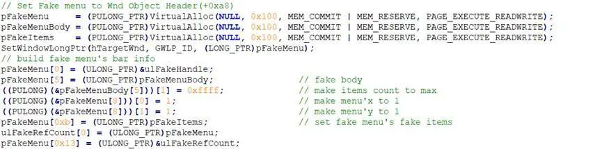 另外,通过GetMenuBarInfo构造Read Primitive时,需要提前构造Fake Menu(用户层),再通过SetWindowLongPtr对Target Wnd的Menu(内核层)进行替换,以达到读取地址可控的目的。