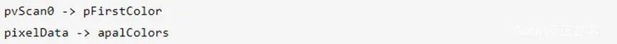 PALETTE结构中,有三个成员是值得我们关注的分别是cEntries、pFirstColor、apalColors。cEntries指定当前调色板的项数,pFirstColor指向调色板列表起始表项(apalColors)的地址,apalColors是一个结构体数组存储调色板列表数据。