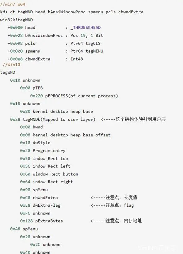 CreateWindowEx是用来创建窗口,在漏洞利用的世界中,Wnd地位是非常高的,可被用来进行堆spray,越界写的容器等等。此次我们仅介绍Wnd的pExtraByte字段,分析它在内核中生成的过程。