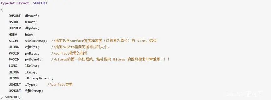 SURFOBJ(Bitmap核心结构),用于控制位图的大小,像素等信息。