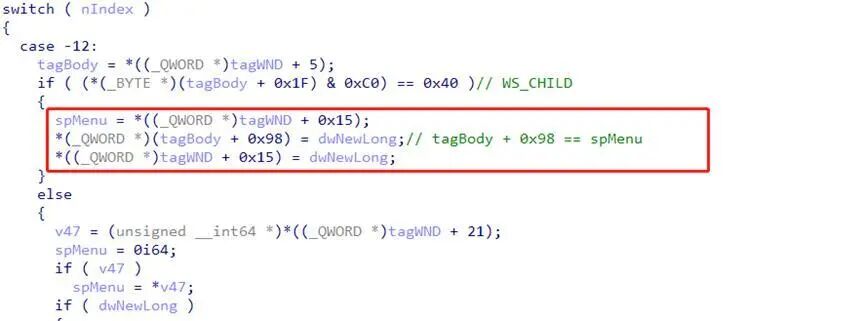 xxxSetWindowData函数可以对Wnd的spMenu进行替换,这是我们能够利用Menu构造Read Primitive的先决条件。