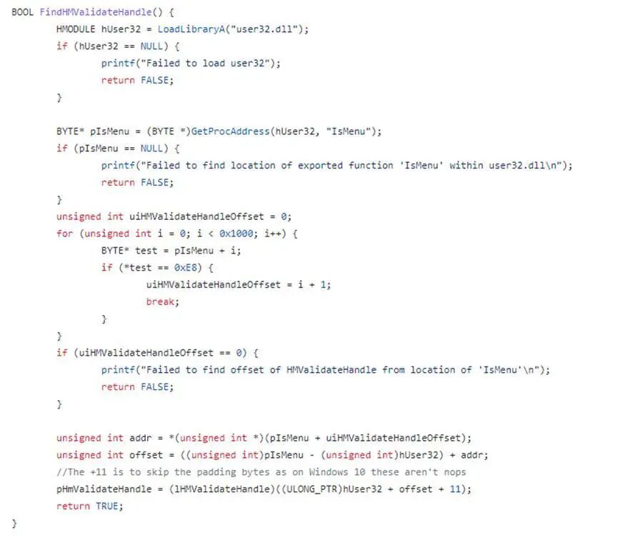HMValidateHandle是微软未公开的一个函数,凭借此函数可以通过传入句柄获取对于内核对象的地址(win32k对象)。HMAllocObject创建了桌面堆类型句柄后,会把tagWND对象放入到内核模式到用户模式内存映射地址里。为了验证句柄的有效性,窗口管理器会调用User32!HMValidateHandle函数读取这个表。函数将句柄和句柄类型作为参数,并在句柄表中查找对应的项。如果查找到对象, 会返回tagWND只读映射的对象指针,通过tagWND这个对象我们可以获取到句柄等一系列窗口信息。