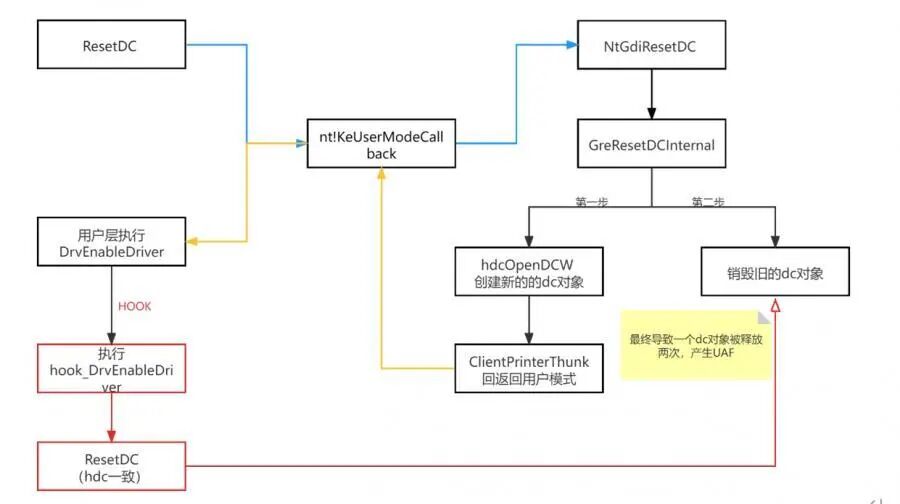 CVE-2021-40449 是Win32k 的 NtGdiResetDC 函数中的一个释放后使用漏洞,在执行其自己的回调期间针对同一句柄第二次执行函数 ResetDC 时触发UAF漏洞。