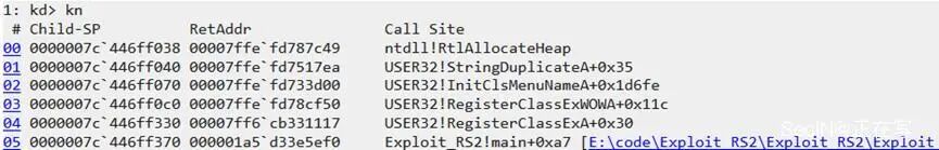 到这,相信大家都知道可以通过桌面堆对象进行占坑,并控制lpszMenuName的大小与bitmap大小一致。即可成功泄露bitmap的内核地址。lpszMenuName申请内存过程堆栈如下,其大小为实际申请大小。