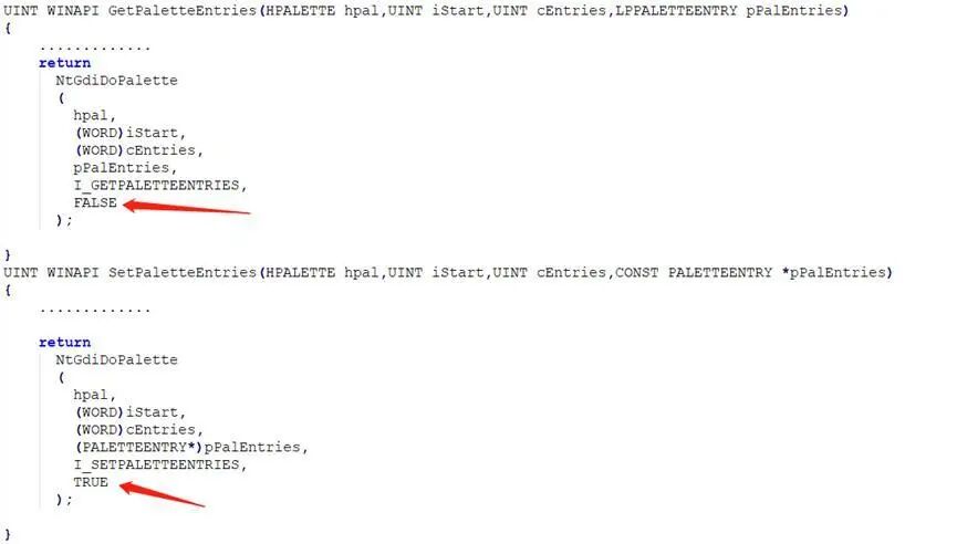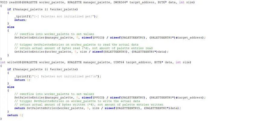 – Palette系列:GetPaletteEntries/SetPaletteEntries可对内核对象Palette的成员pFirstColor(指向4个bytes的数组PALETTENTRY)修改构造RW原语。