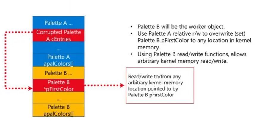 – 构造对内核任意地址的RW原语(GetPaletteEntries/ SetPaletteEntries)