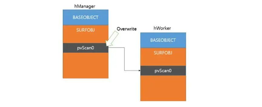 - 利用任意地址覆盖写漏洞,将hManager的pvScan0修改为指向hWorker成员pvScan0的地址。