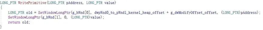 d)借助SetWindowLongPtr的修改能力,最后使Wnd1获得任意地址写入能力。