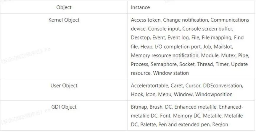 结合网上资料,Windows 中存在着 3 种类型的对象,分别为 User object、GDI object、Kernel object,一共有 40 多种对象。