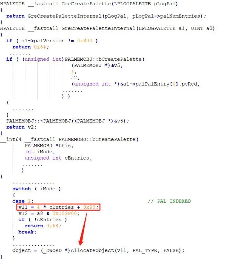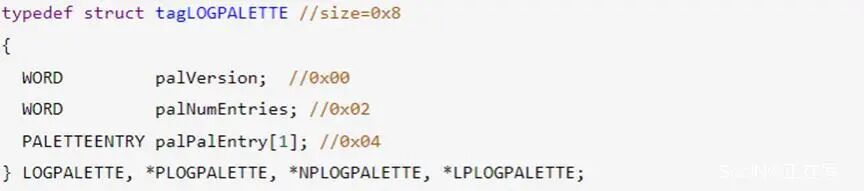 显然,我们可以得出palette对象大小的计算方式:4 * cEntries + 0x90/PALETTE/