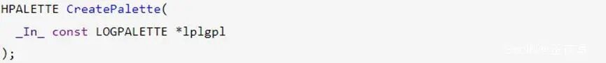 Createpalette函数用来创建调色板对象,其只有一个参数lplgpl是指向LOFGPALETTE类型结构体对象的指针。定义如下: