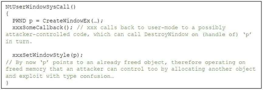 下图代码为一个经典UAF漏洞,用户层执行的某个函数通过syscall传入到内核层,当内核代码执行到xxxSomeCallback这一句时,用户层可以在用户定义的callback函数中获得代码执行的机会,如果用户在callback函数调用了DestroyWindow函数销毁窗口p,内核层的相应销毁代码将会被执行,p的相应内存被释放,回调执行完毕,NtUserSysCall函数继续执行,当执行到xxxSetWindowStyle(p)一句时,由于p的内存已经被释放从而导致UAF漏洞的产生。