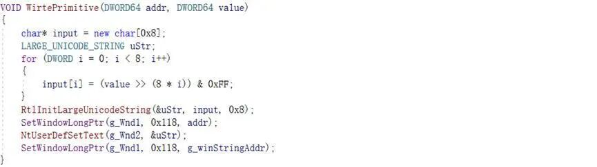 Wnd->StrName 字段是指向窗⼝标题名的指针,通过修改此变量,再借助⽤户态下 的 InternalGetWindowText 和 NtUserDefSetText 函数则可实现任意内核地址读写