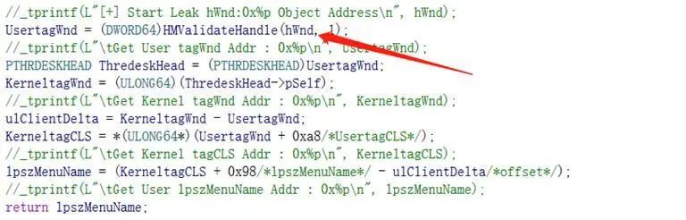 通过HMValidateHandle泄露Wnd的内核地址,然后通过用户态的tagCLS获取lpszMenuName(0x98)的地址。