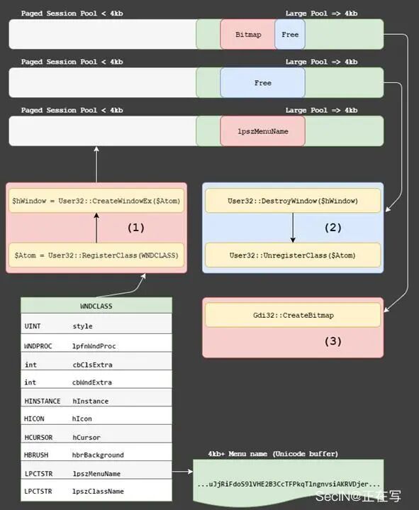 下图来自fuzzySecurity的blog,精确的展现出通过lpszMenuName进行UAF后泄露bitmap的过程。