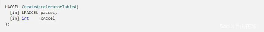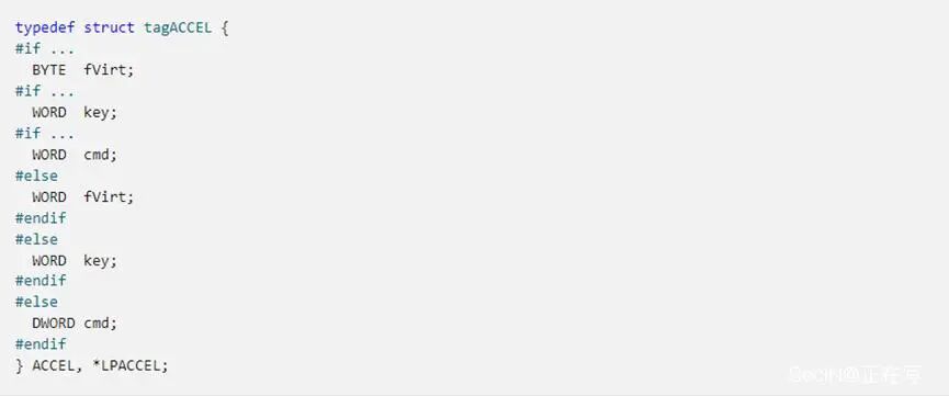 该函数存在 LPACCEL lpaccl 和 int cAccel 两个参数。参数 lpaccl 作为指向 ACCEL 结构体类型数组的指针,cAccel 表示数组的元素个数。结构体 ACCEL (szie=6)的定义如下: